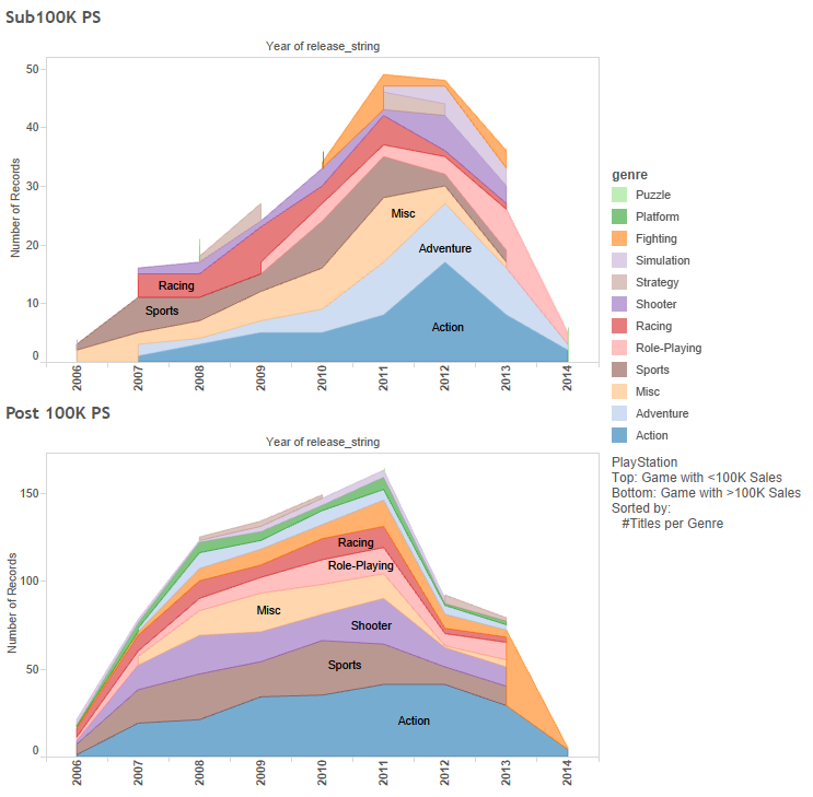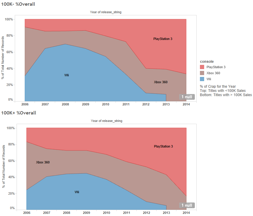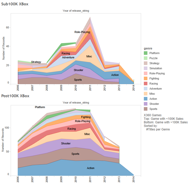 With the Wii, we see a crapware flooding the market library, at least in terms of sales. This has nothing to do with how good the game is, which is left for a later article. The most crap comes in at the half-life of the console, with ~120 crap games vs ~200 less-crap games. But that does mean that at least 1/3, 1 in 3, look to the left and right of you and one of you is a shitty game. Well, actually the X360 had ~70:~150 which is just as bad, but the PS3 had ~50:~150 at its worse year making it the king of sales with only 25% of games not selling that well. For the Wii, no genre outperformed over the rest, they were all equally shitty. For the other consoles, though, there was some fan favoritism. Action games were most successful than not for the X360, but Sports games were more successful than not on the PS3 while the opposite is true for the X360.