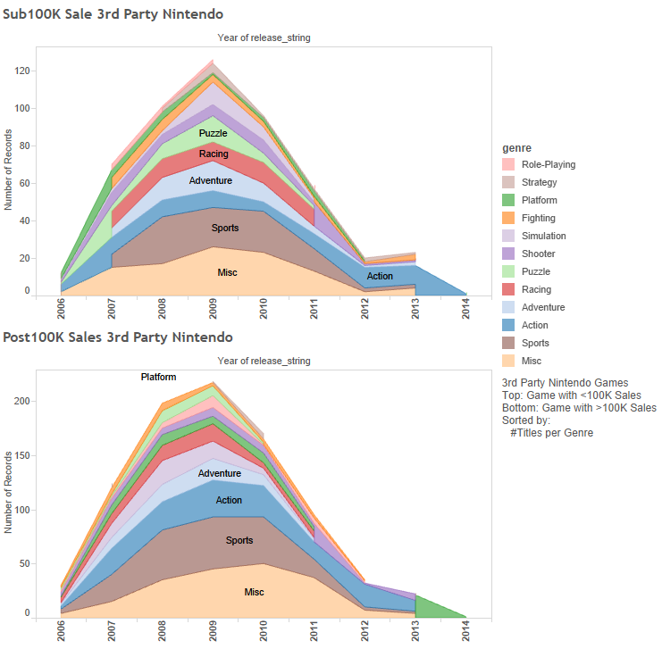 What’s funny is I have the graph annotated for top sales, but you can easily guess what each spike in Genre Sales is. The humungous Sports spike at the beginning is Wii Fit sales. Almost any Platformer spike is due to a Mario game. In Fact, most spikes in sales are due to 1st party games, which leads to the question of how do the sales look without Nintendo in the picture?