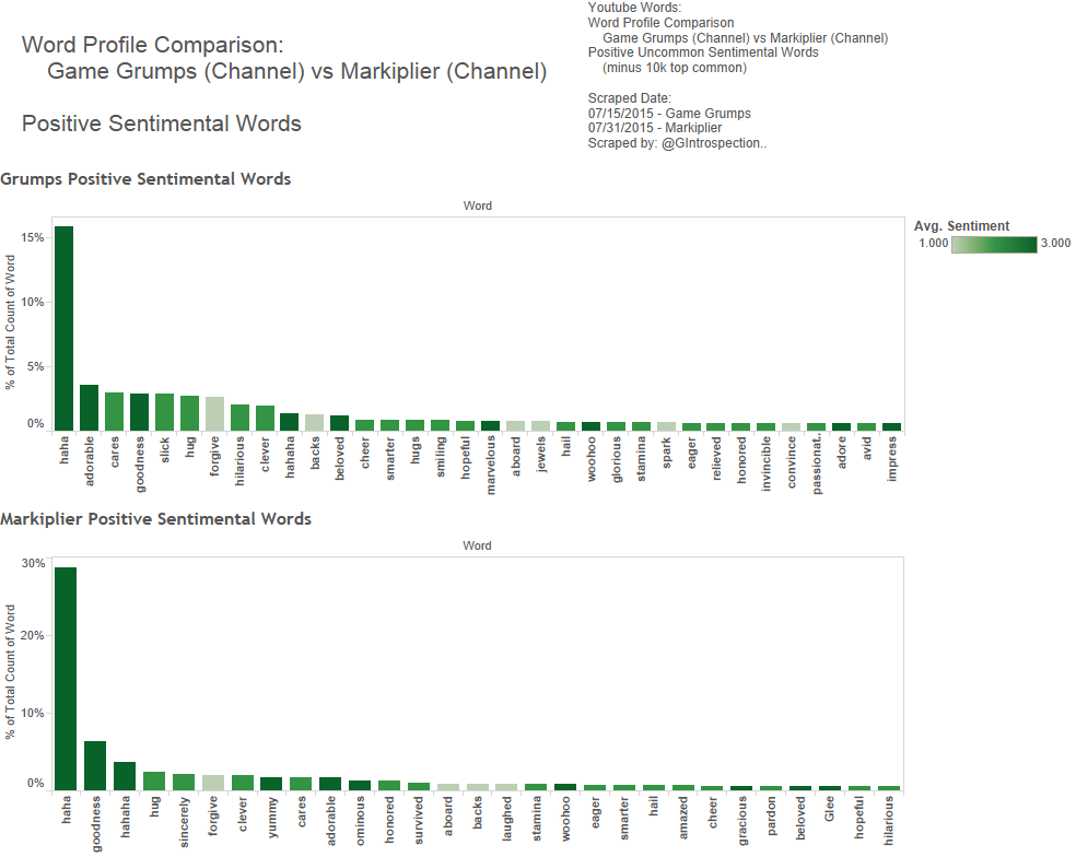 Looking more into the Sentimental words used, this time the Positive Sentimental only, it seems like Mark’s channel is a much more fun place. They laugh a lot on Mark’s channel, like by a significant margin of a lot. Double-ish. You can probably blame this spike of laughter from the various compilation videos from Happy Wheels, Prop Hunt, Highlights, the comedy indie-games played and the variety of Co-op videos that are on his channel which have highly concentrated edits of laughter and exaggeration to keep the energy high. I don’t have a definitive answer as to why the laughter is so much more. It could even be as simple as Mark + gang are easier to laugh and joke and be goofy with one another where the Grumps tell stories about their lives and laugh at the ridiculous on screen rather than being generally goofy on-air.