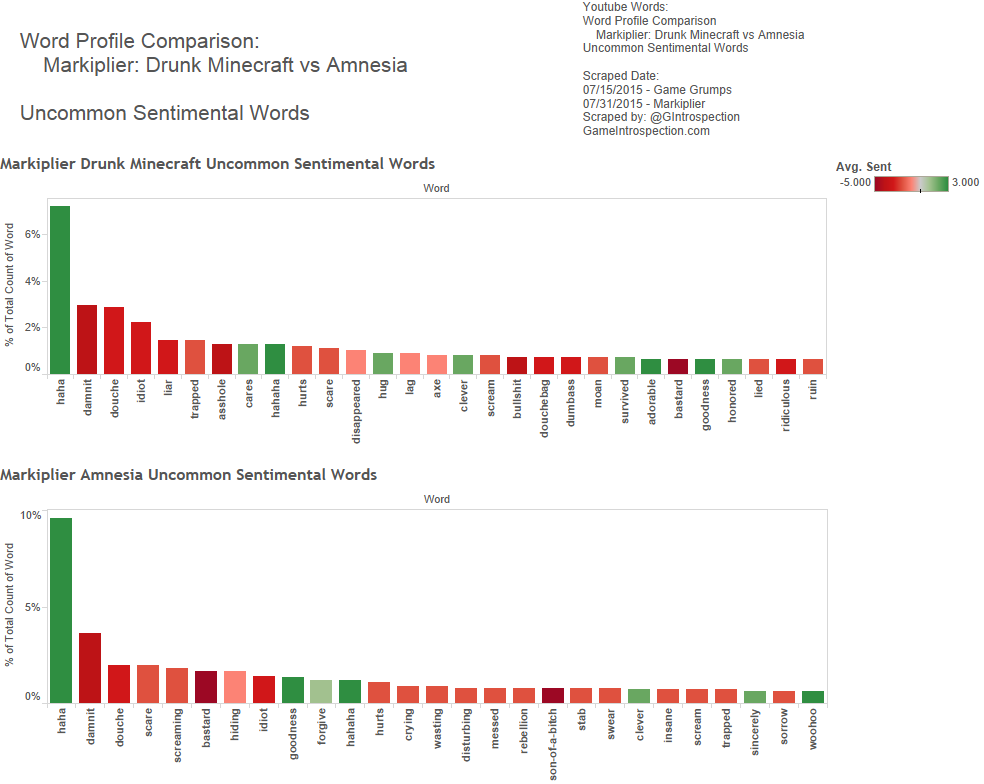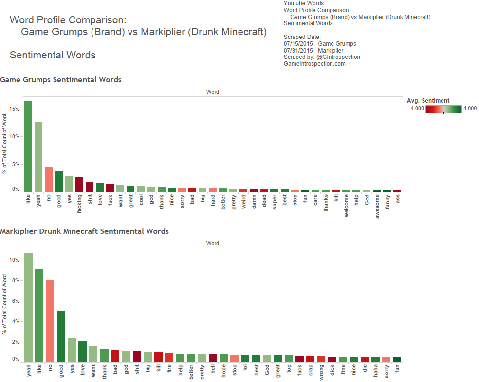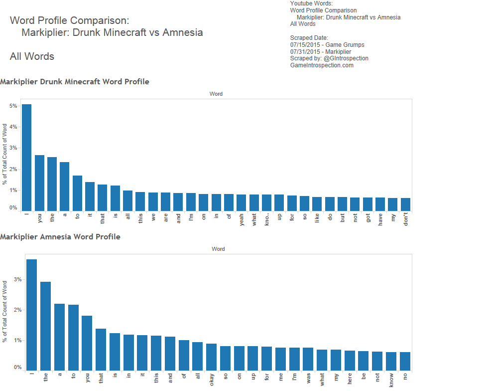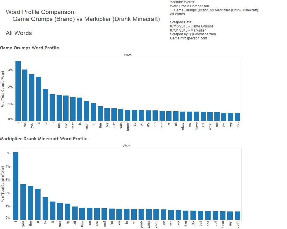 We made comparisons between Markiplier’s channel and the Game Grump’s channel as wholes though the structures are fairly different from one another. Markiplier’s episodes are a mixed bag of solo-plays, compilations, cooperative multiplayer playthroughs and competitive multiplayer playthroughs. The Game Grumps videos have a different case depending on which brand you’re viewing (Game Grumps, Steam Train, etc…) and also are mixed between single player, co-op multiplayer and competitive multiplayer. This shifts the balance of words used a bit because the context for vocabulary will be different.